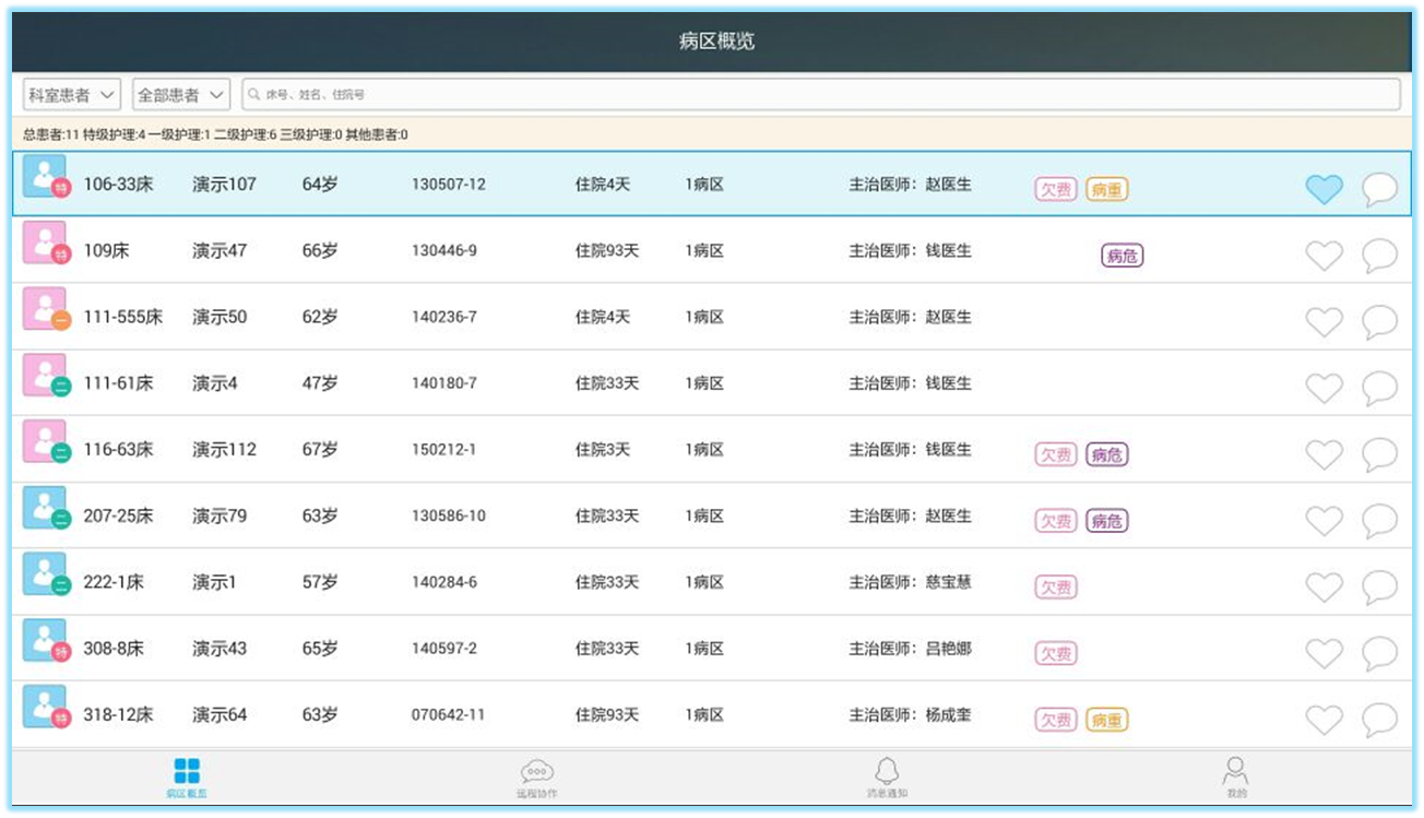 病情概覽——床位號(hào)、姓名、年齡、住院時(shí)間、病區(qū)、主管醫(yī)師