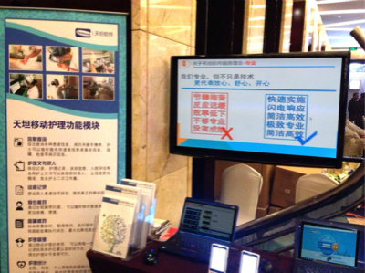 展會期間我公司接待了觀展及參展人員數(shù)百人,眾多人員關(guān)切詢問我公司產(chǎn)品,本次展會我公司展出了天坦移動護(hù)理系統(tǒng),天坦移動查房系統(tǒng),及醫(yī)療大數(shù)據(jù)分析平臺,通過現(xiàn)場演示受到了眾多專業(yè)人士和媒體的高度關(guān)注,尤其是天坦移動護(hù)理系統(tǒng)吸引了眾多觀眾的眼球。