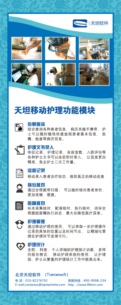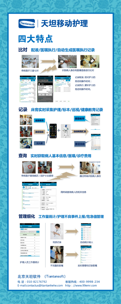 天坦移動護(hù)理系統(tǒng)改變傳統(tǒng)護(hù)理工作模式。將審藥、配藥、治療等環(huán)節(jié)實(shí)現(xiàn)移動化、條碼化、共享化。確保信息準(zhǔn)確,用藥安全;系統(tǒng)將護(hù)理工作變得更方便、更自由,護(hù)士可以在任何地點(diǎn)調(diào)取病歷、化驗(yàn)報告、檢查影像,利用各種移動終端完成醫(yī)囑執(zhí)行、床前護(hù)理文書錄入等護(hù)理操作,極大地減少護(hù)理管理人員的工作量,提高整個護(hù)理工作的工作效率與醫(yī)療質(zhì)量。