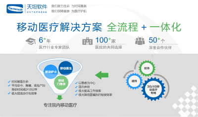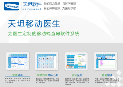 除了卒中綠色通道之外,天坦軟件在大會(huì)上還展出了移動(dòng)醫(yī)護(hù)產(chǎn)品,主要涉及天坦移動(dòng)醫(yī)生和天坦移動(dòng)護(hù)士。天坦移動(dòng)醫(yī)生是專門(mén)為醫(yī)生定制的移動(dòng)查房系統(tǒng),具有智能查房,協(xié)同醫(yī)療、智能輔助等特點(diǎn),是隨時(shí)隨地的病歷夾;天坦移動(dòng)護(hù)士是專門(mén)為護(hù)士定制的移動(dòng)護(hù)理系統(tǒng),支持全程條碼信息核對(duì),臨床信息移動(dòng)化錄入,隨時(shí)隨地信息查詢以及護(hù)理管理等。