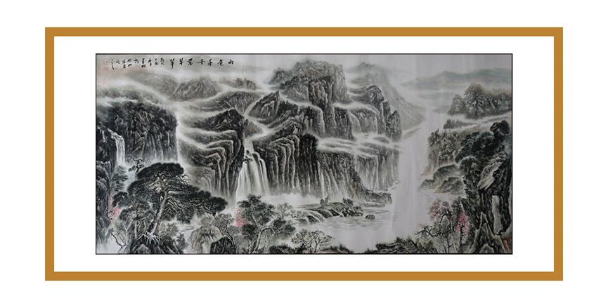 欣賞譚老的畫作,使人有一種難以言表的美感,問及原因,他說:“為了研究山水,我閱讀了大量古、今書籍,我發(fā)現(xiàn)歷朝歷代對(duì)山水國(guó)畫都相當(dāng)重視,山水被視為鎮(zhèn)宅的代名詞,一直以來在帝王家它都是以圖騰的形式存在的。”但為了能夠更好地傳承歷史文化,他鉆研國(guó)學(xué),將儒、釋、道的精髓理念及思想融入到作品中,追求創(chuàng)造的是一種“和合”之感,讓這大氣之圖騰成為真正意義上的圖騰。